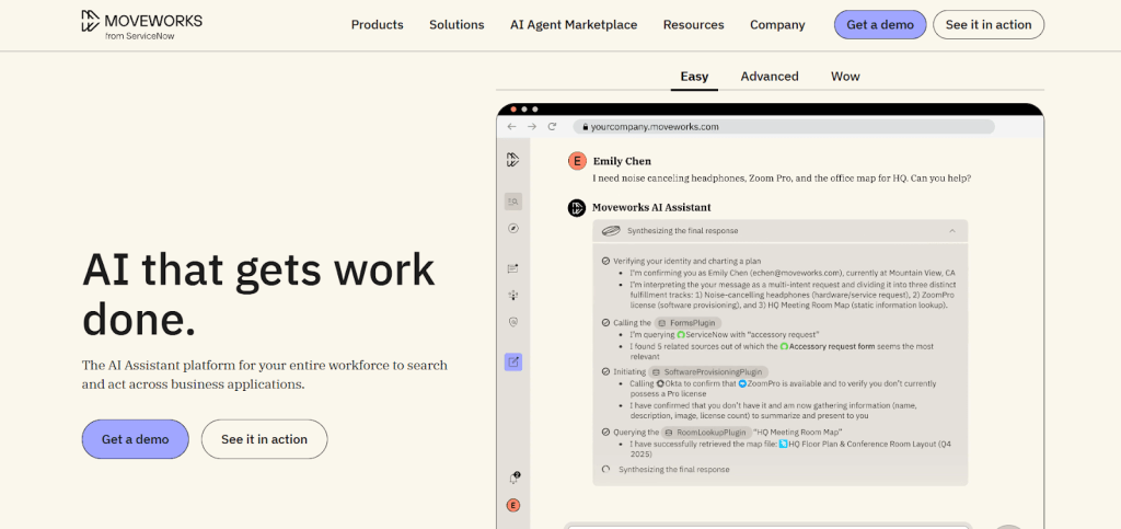 Moveworks is an agentic AI platform that helps organizations automate employee-facing workflows across HR, IT, finance, and other functions. Its AI assistant lives inside tools like Slack and Microsoft Teams, allowing employees to get answers and complete tasks without switching apps. The platform pulls information from trusted internal systems and cites sources, improving accuracy and trust.