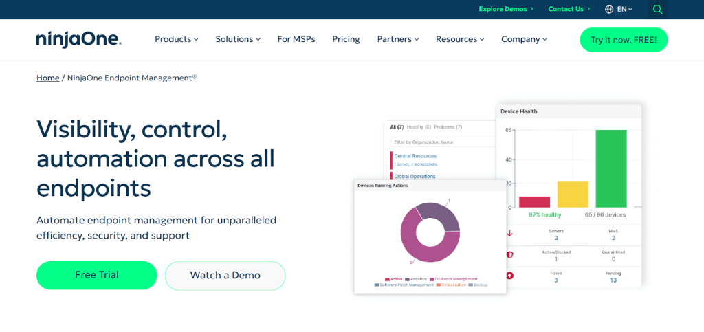 NinjaOne is a unified endpoint management platform built to give IT teams complete visibility and control over all devices. It streamlines patching, monitoring, and device maintenance through automation, helping teams reduce manual work and resolve issues faster. With its real-time insights and easy-to-use interface, NinjaOne makes managing large, distributed environments simple and efficient.