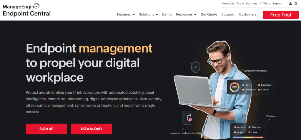 ManageEngine Endpoint Central is an all-in-one platform for managing and securing every device in your organization. It unifies endpoint management, security, and automation under a single console, helping IT teams patch, monitor, and protect systems efficiently while improving user experience.