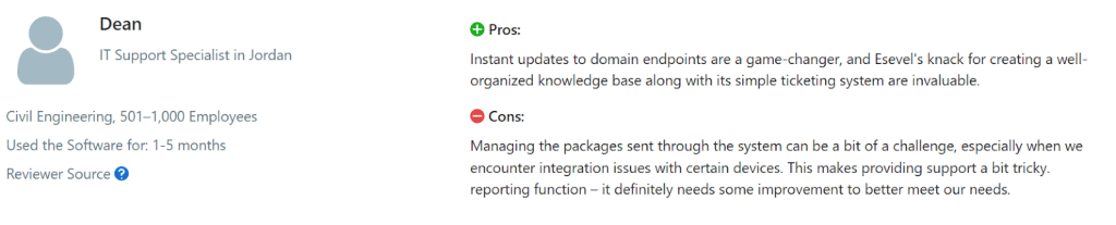 Esevel is highly rated for simplifying IT management, but like any platform, it isn’t perfect for everyone. Some businesses find their pricing structure, limited flexibility, or integrations less than ideal. A few users also noted challenges with device compatibility and package management, along with reporting features that felt too limited for their needs.