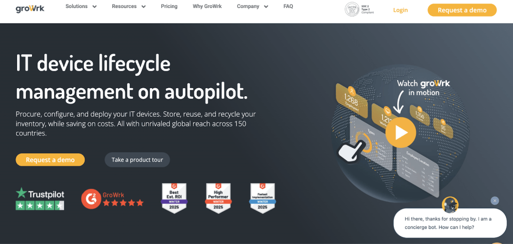 GroWrk is a global IT asset management platform that covers procurement, deployment, remote support, and device retrieval across 150+ countries. It offers zero-touch deployment for macOS, Windows, and Linux, along with SOC2-certified security and integrations with HRIS, ERP, and payroll tools. While strong in global reach, some users mention frustrations with prepayment requirements, limited stock availability, and less transparent support.