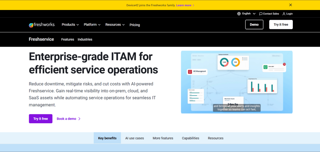 Freshservice by Freshworks embeds ITAM in a user-friendly ITSM suite, handling discovery, catalogs, and audits effortlessly. It supports quick onboarding for growing teams with mobile access and blueprint mapping. A strong pick for SMBs wanting simplicity over complexity.