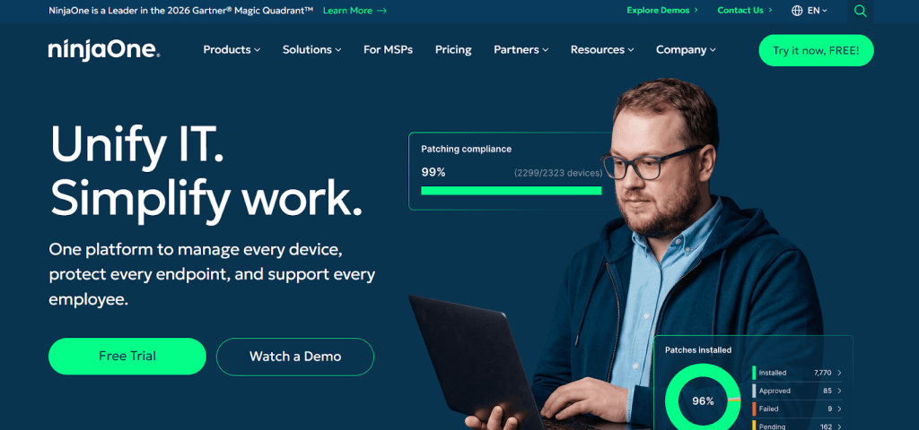 NinjaOne merges ITAM with RMM for endpoint-focused tracking, patching, and monitoring. Centralized views suit MSPs and IT ops needing remote control and compliance. It streamlines operations beyond pure inventory tools.