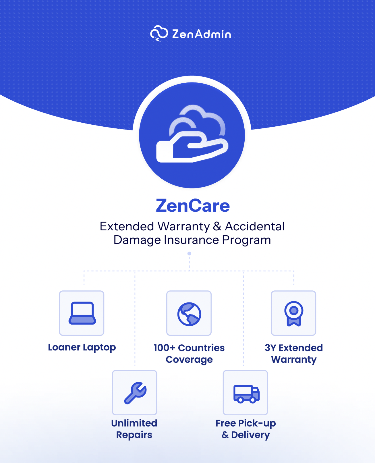 ZenAdmin, on the other hand, recently released ZenCare (an extended warranty and accidental damage protection plan)for global teams. So you don’t have to worry about confusing warranties or claims that take forever. ZenCare offers 3Y Extended Warranty, Unlimited Accident Repairs, Free Pick-up & Delivery, Coverage in 100+ Countries, and more.