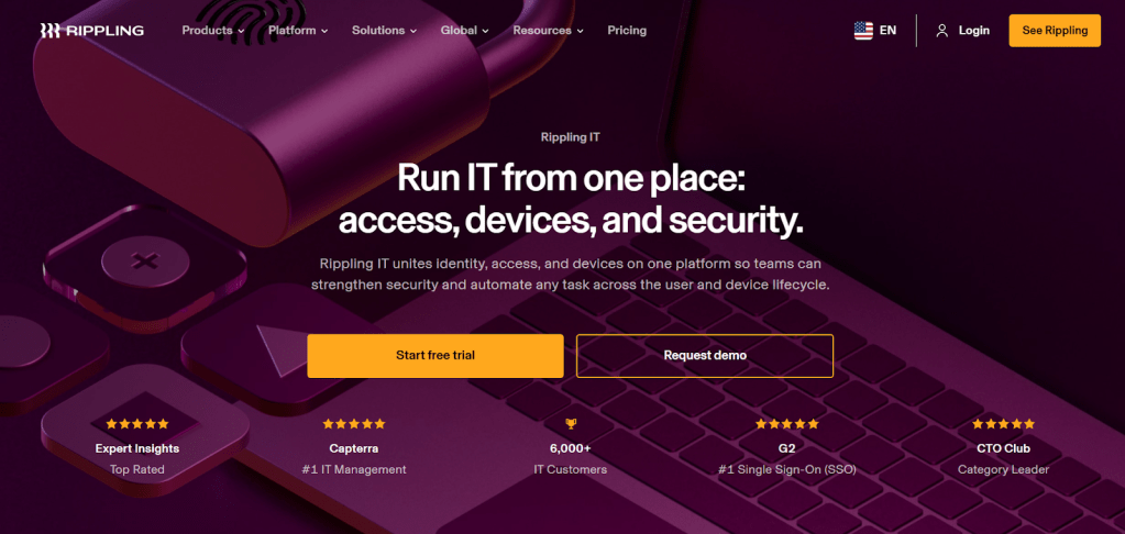Rippling is an HR and IT onboarding platform that connects hiring data with device provisioning and access setup. IT can ship preconfigured laptops, assign apps and permissions, and track inventory from one dashboard, with onboarding and offboarding triggered automatically by HR events.
