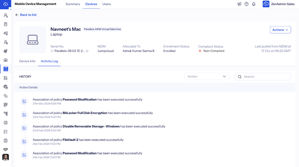 ZenAdmin centralizes all compliance-related activities through a unified dashboard that stores details of licenses, warranties, and regulatory certifications for every device and software instance. Everything action has a complete audit trail for it.