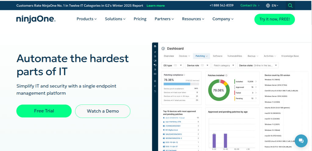 NinjaOne focuses on endpoint management and IT service automation. It enables teams to monitor device health, automate patching, roll out software updates, and back up systems—all from a unified dashboard. Its scripting engine also allows for advanced customization, giving IT teams flexibility to adapt automation to their specific environment.